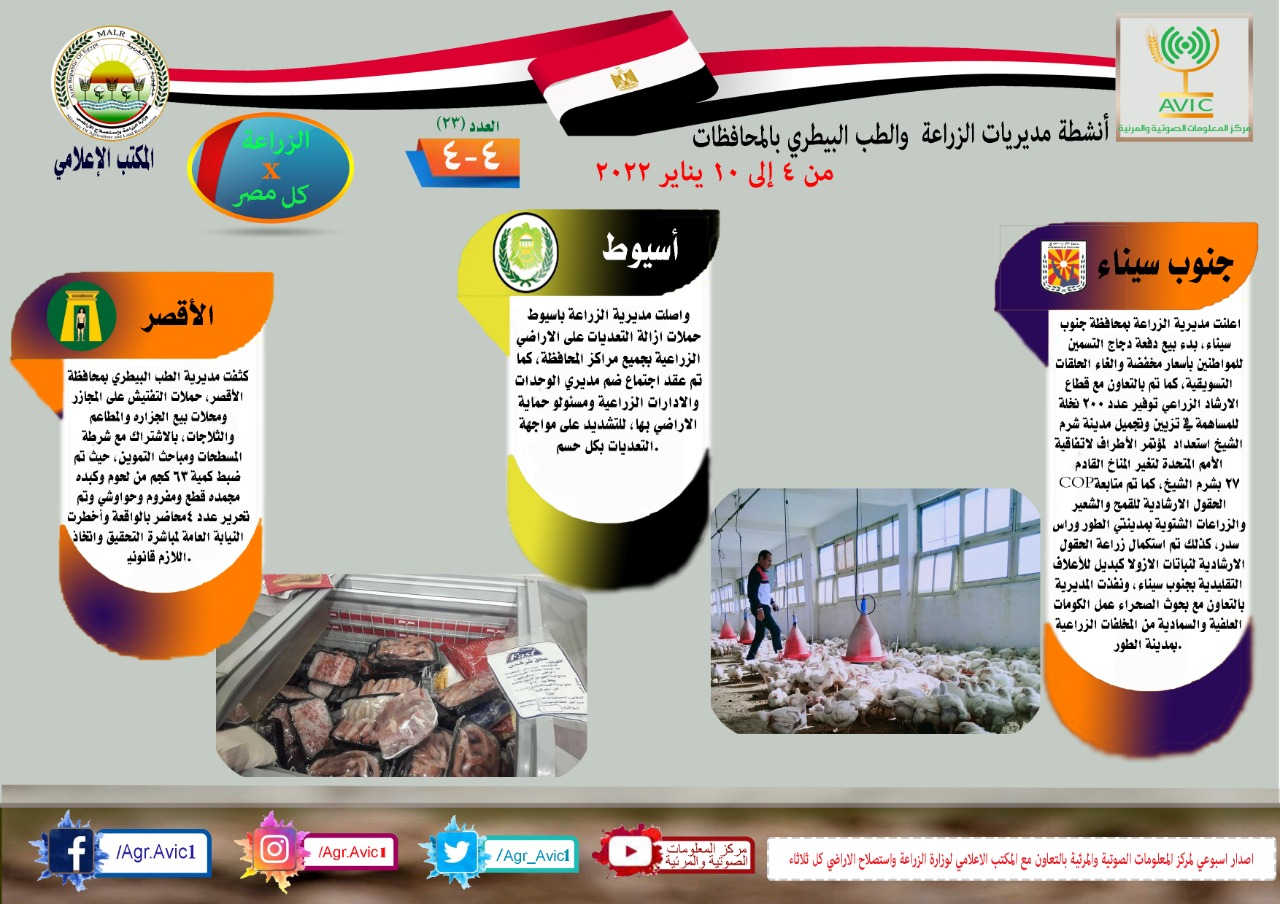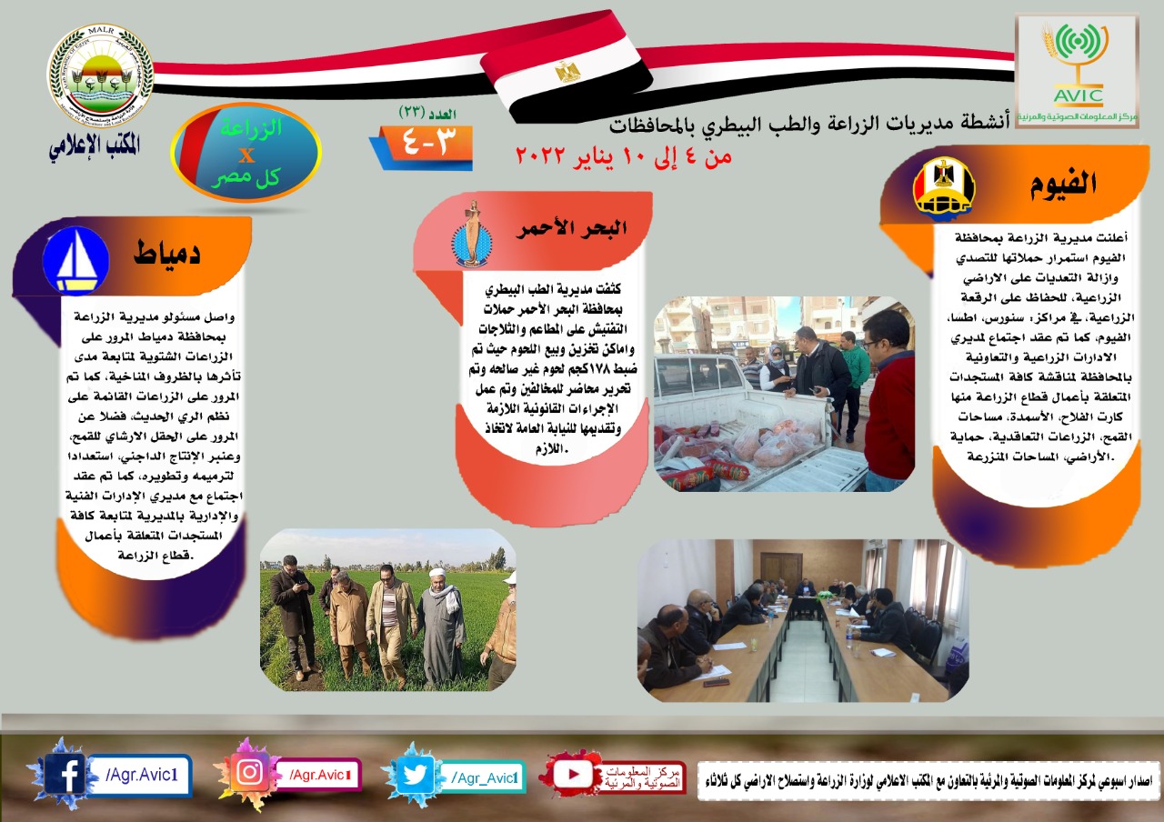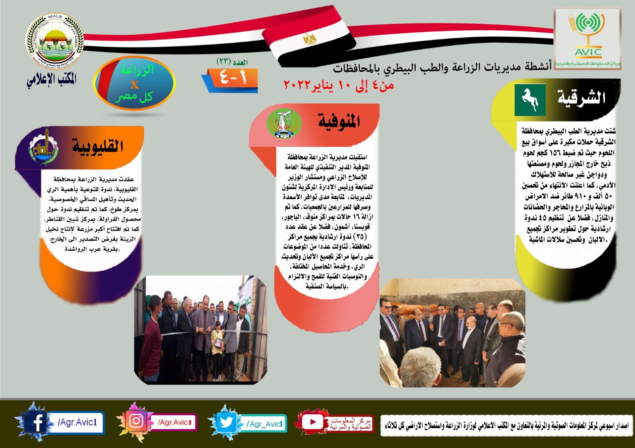 أصدر مركز المعلومات الصوتية والمرئية التابع لـ وزارة الزراعة واستصلاح الأراضي، انفوجراف بعنوان الزراعة في كل مصر، حيث يوضح الجهود والأنشطة التي تقوم بها مديريات الزراعة والطب البيطري بمحافظات الجمهورية، وذلك خلال الفترة من 4 وحتى 10 يناير الجاري الجاري.