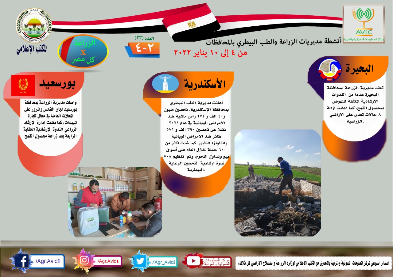 كما أعلنت مديرية الطب البيطري بمحافظة الإسكندرية، تحصين مليون و40 ألف و274 رأس ماشية ضد الأمراض الوبائية في عام 2021، فضلا عن تحصين 390 ألف و571 طائر ضد الأمراض الوبائية وإنفلونزا الطيور، وشنت أكثر من 600 حملة خلال العام على أسواق بيع وتداول اللحوم، وتم تنظيم 508 ندوة إرشادية لتحسين الرعاية البيطرية، كذلك واصلت مديرية الزراعة بمحافظة بورسعيد لجان الفحص والمرور على المحلات العاملة في مجال تجارة المبيدات، ونظمت إدارة الإرشاد الزراعي؛ الندوة الإرشادية الحقلية الرابعة بعد زراعة محصول القمح.
