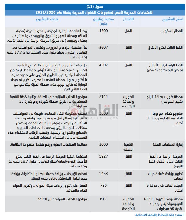 وأدرجت الحكومة؛ مجموعة من المشروعات الخضراء التي يمكن أن تمول بواسطة السندات الخضراء في خطة العام المالي 2021/2020؛ تبلغ نحو 691 مشروعا، تبلغ تكلفتها الكلية 447.3 مليار جنيه، ومدرج لها اعتمادات بنحو 36.7 مليار جنيه وبما يشكل نسبة 14% من إجمالي الاستثمارات العامة الموزعة في الخطة، وقد ظفر قطاع النقل المستدام بالنصيب الأكبر من هذه المشروعات بنسبة 50% من الاعتمادات المدرجة للمشروعات الخضراء بالخطة.