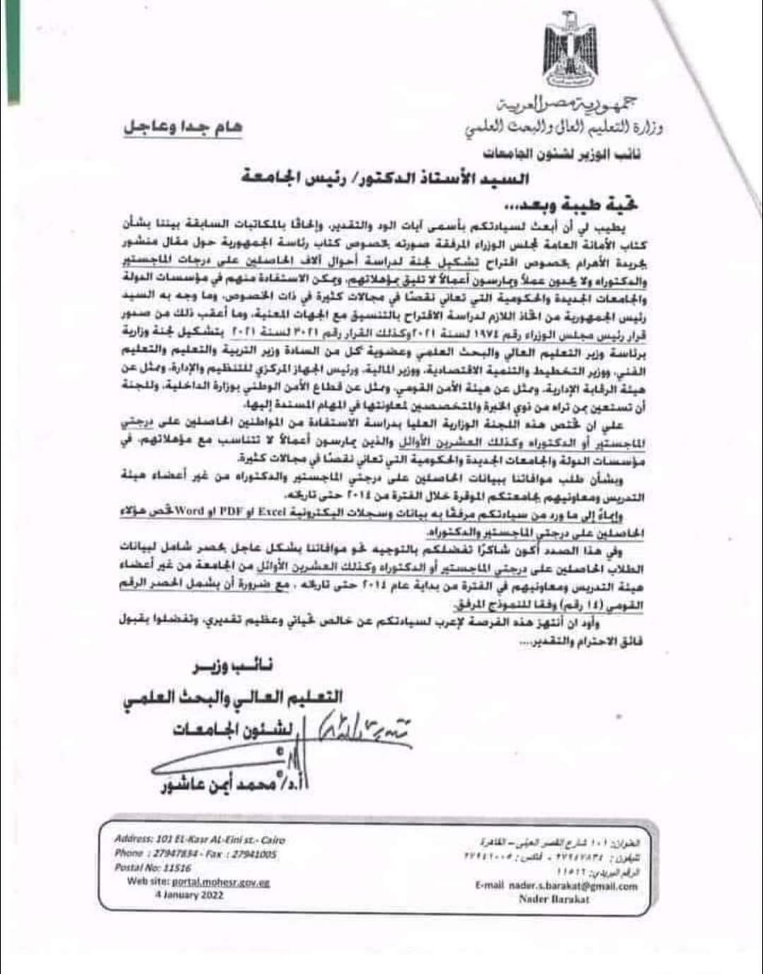 كشفت مصادر مسئولة من داخل وزارة التعليم العالي والبحث العلمي، أن هناك خطابا تم إرساله من الدكتور محمد أيمن، نائب وزير التعليم العالي والبحث العلمي لشئون الجامعات، إلى رؤساء الجماعات، وذلك لحصر عدد الحاصلين على الماجستير والدكتوراه وأوائل الخريجين في جميع الكليات.