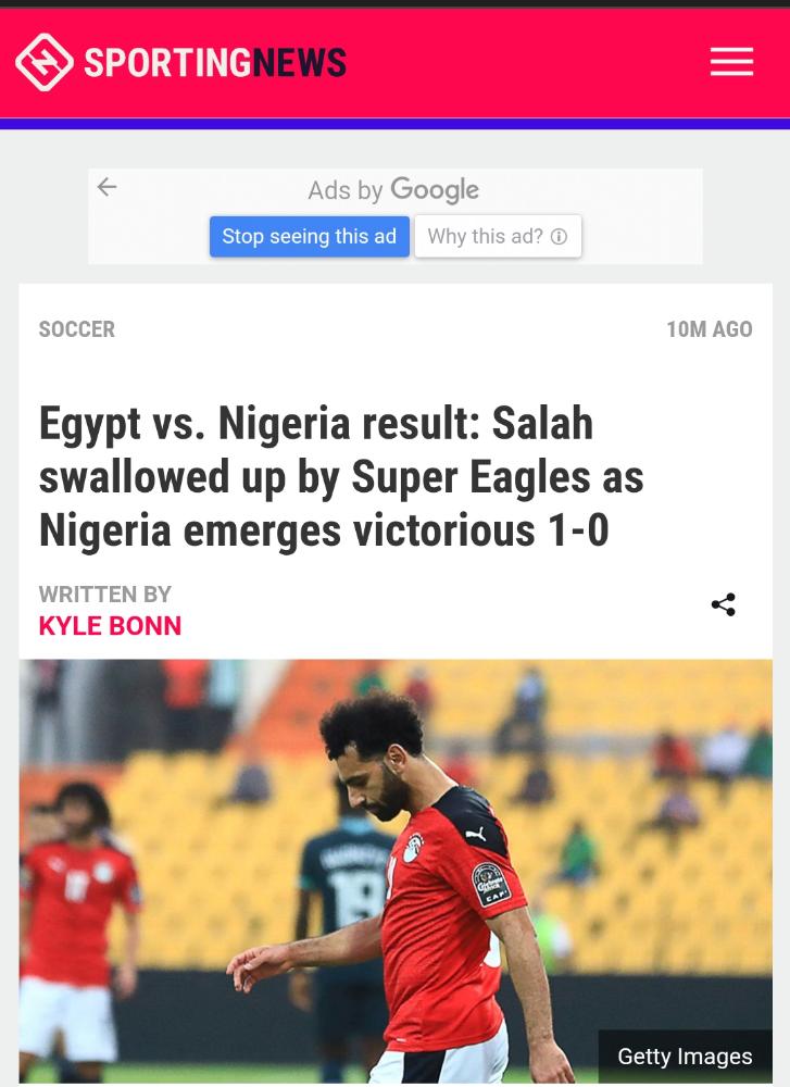تصدر عنوان، مفعول صلاح السحري يتوقف بمنتخب نيجيريا بافتتاحية المجموعة الرابعة من كأس الأمم الإفريقية، صحيفة complete sport بعد نهاية المباراة.