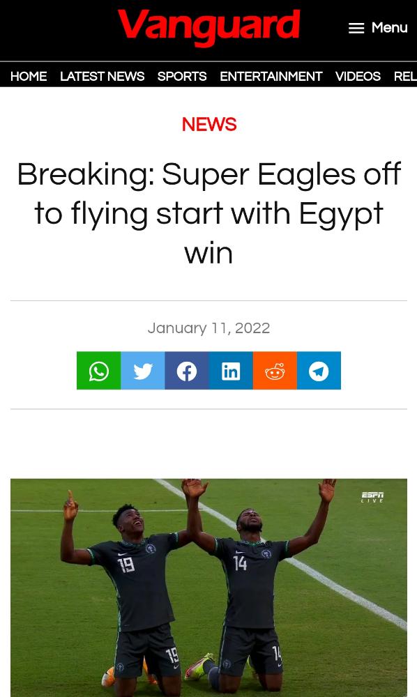 وتناولت شبكة فان جارد مباراة مصر ونيجيريا بعنوان، سوبر إيجلز يبدأون التحليق في أمم إفريقيا بالفوز على مصر.
