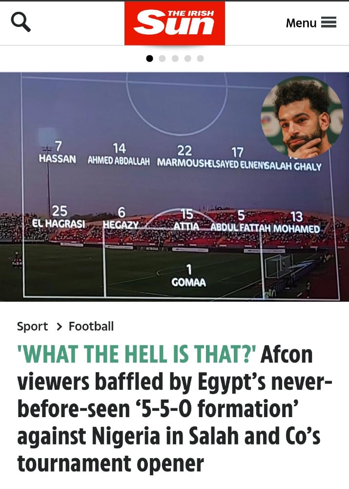 ونشرت ذا صن تقريرًا عقب نهاية مباراة مصر ونيجيريا فيما يتعلق بخطة كيروش التي أثارت الجدل قبل المباراة وطريقة اللعب الخاصة بها، حيث عنونت الصحيفة بـ "ما هذا! منتخب مصر يدفع بخطة 5-5-0.. وتسببت في خسارة محمد صلاح أمام نيجيريا وغضب الجماهير.