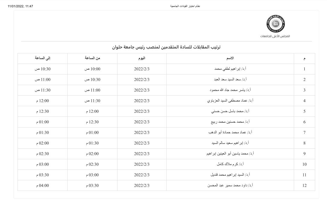 وفي وقت سابق أعلنت لجنة اختيار القيادات الجامعية بالمجلس الأعلى للجامعات، يوم الجمعة الموافق 7 يناير القائمة المبدئية لرئيس جامعة حلوان، وذلك بترشيح 13 عضو هيئة تدريس، وكان المجلس الأعلى الجامعات أعلن في 21 ديسمبر 2021 فتح باب التقدم للترشح للمنصب.