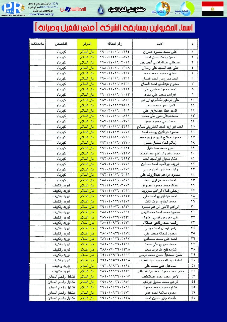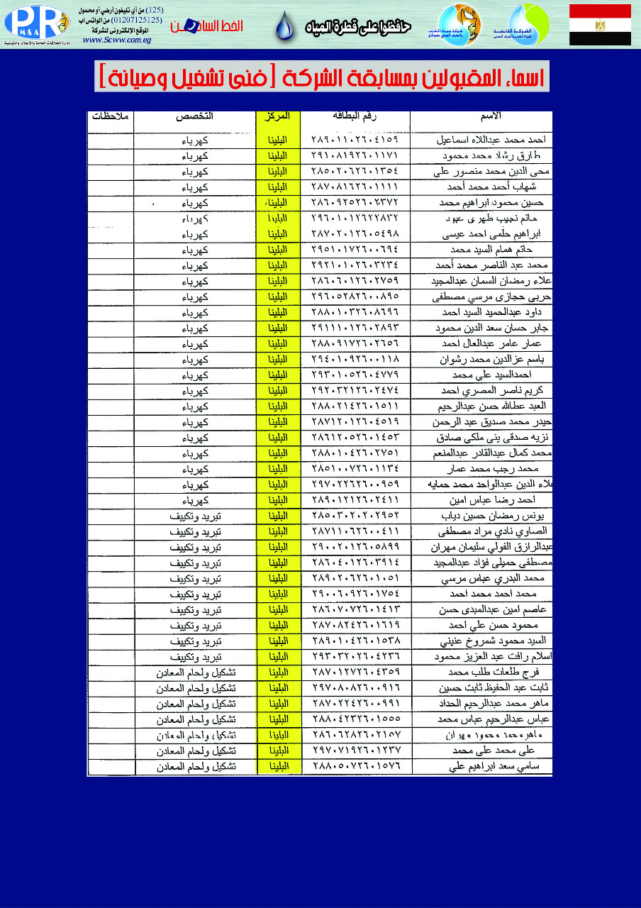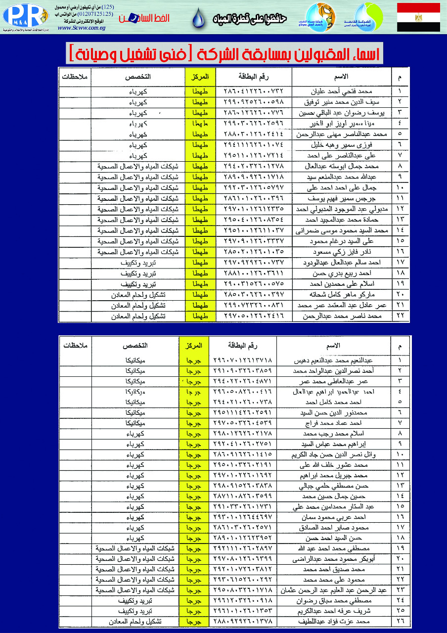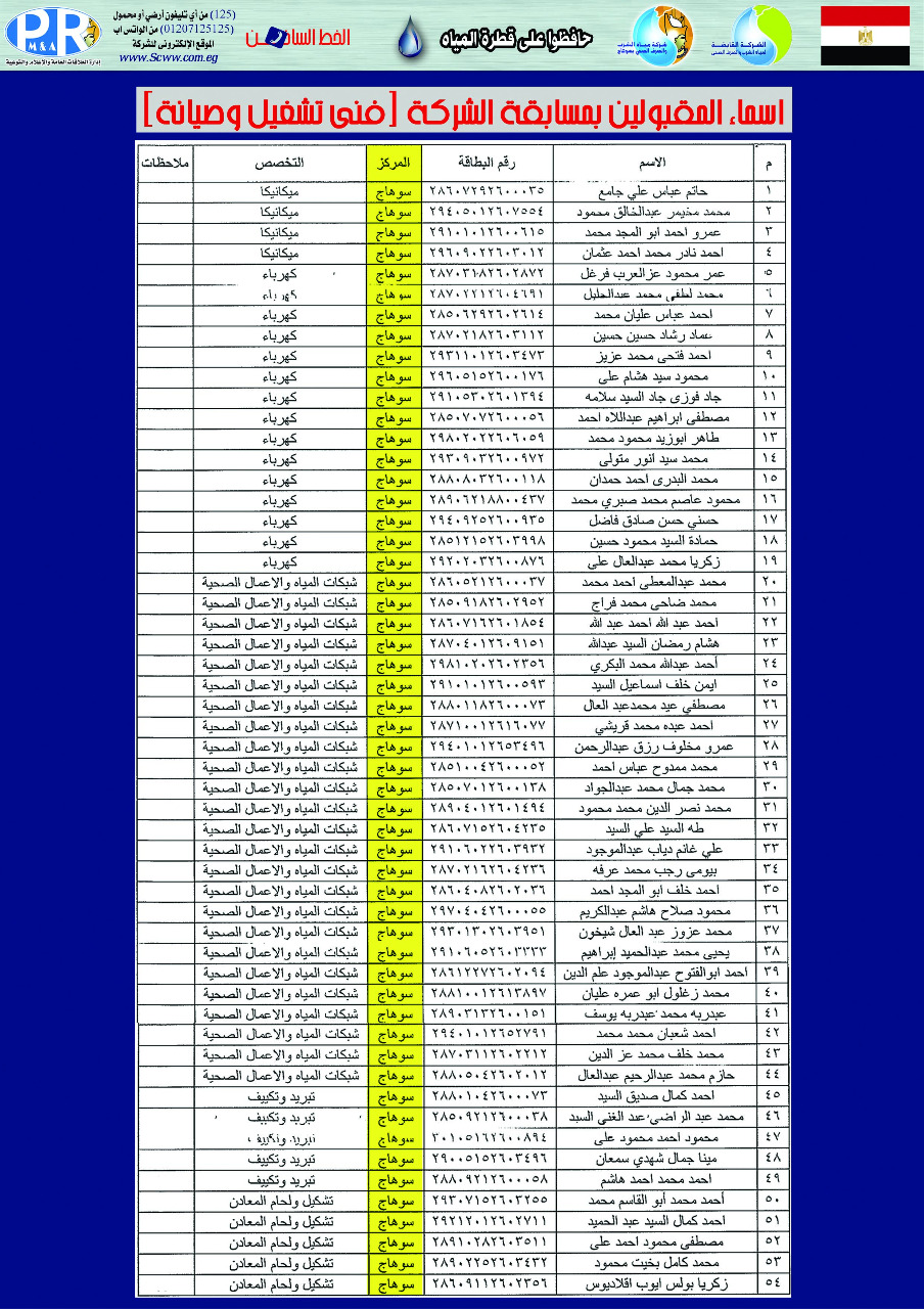 الجدير بالذكر إنه تم قبول 54 فني تشغيل وصيانة بمركز سوهاج، وعدد 19 فني تشغيل وصيانة بمركز أخميم، 21 بمركز ساقلتة، 41 بمركز البلينا، 26 بمركز جرجا، بالإضافة إلى 21 فني تشغيل وصيانة بمركز جهينة، 47 بمركز دار السلام، 41 بمركز المراغة، 22 بمركز طهطا، 54 بمركز طما، و33 بمركز المنشاة.