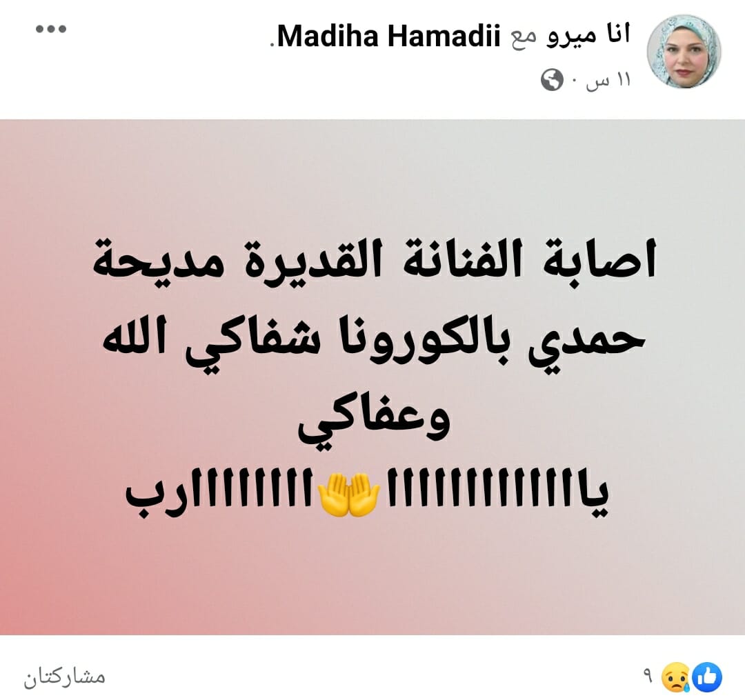 وحرص عدد من جمهور الفنانة على الدعاء لها بالشفاء العاجل، حتى تمر من هذه الأزمة بسلام، حيث تحولت صفحتها الرسمية بموقع التواصل الاجتماعي إلى دعوات، حيث كتب أحد محبيها منشورًا، قال فيه: إصابة الفنانة مديحة حمدي بكورونا، شفاكِ الله وعافاكِ يا رب.