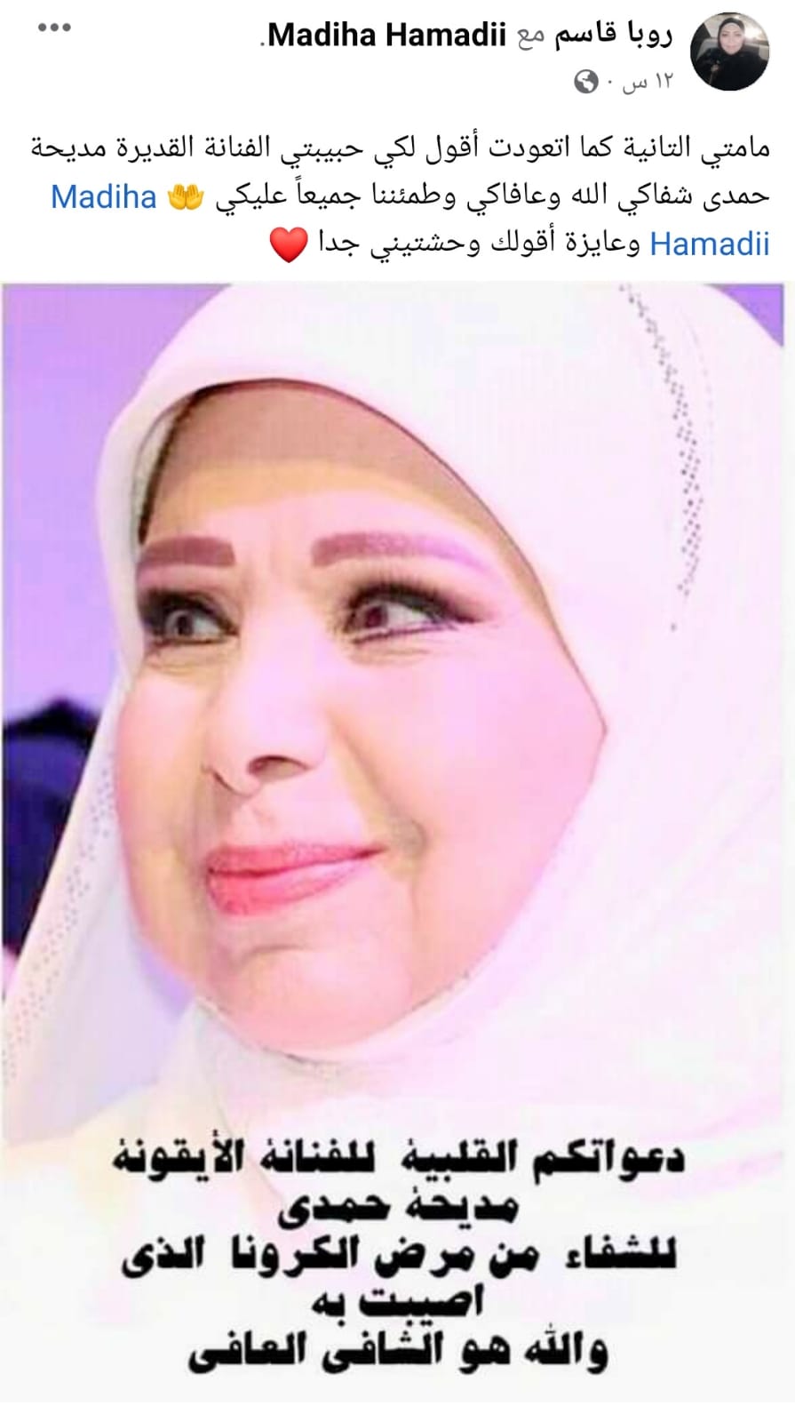 كما كتبت إحدى محبيها منشورًا، آخر قالت فيه: مامتي التانية كما تعودت أقول ليكي، حبيبتي الفنانة القديرة مديحة حمدي، شفاك الله وعافاك وطمأننا جميعًا عليك، وعايزة أقولك وحشتيني أوي.