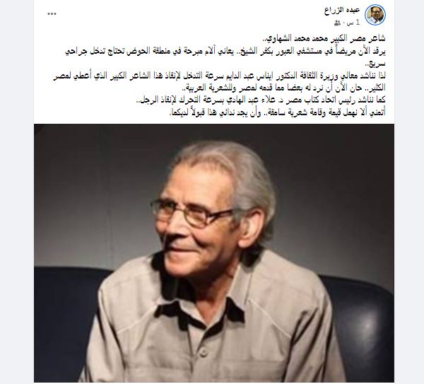 فيما قال عبده الزراع شاعر مصر الكبير محمد محمد الشهاوي يرقد الآن مريضا في مستشفى العبور بكفر الشيخ، يعاني آلام مبرحة في منطقة الحوض تحتاج تدخل جراحي سريع، لذا نناشد معالي وزيرة الثقافة الدكتور إيناس عبد الدايم سرعة التدخل لإنقاذ هذا الشاعر الكبير الذي أعطي لمصر الكثير، حان الآن أن نرد له بعضا مما قدمه لمصر وللشعرية العربية، كما نناشد رئيس اتحاد كتاب مصر د. علاء عبد الهادي بسرعة التحرك لإنقاذ الرجل، أتمنى ألا نهمل قيمة وقامة شعرية كبيرة، وأن يجد ندائي هذا قبولًا لديكما.