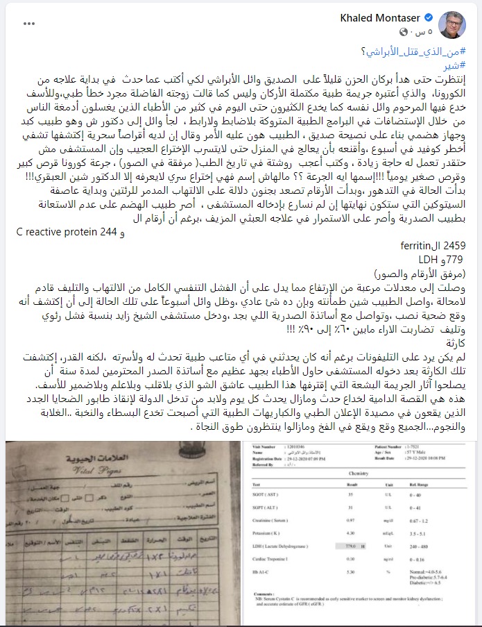 وأردف الطبيب خالد منتصر: بدأت الحالة في التدهور، وبدأت الأرقام تصعد بجنون دلالة على الالتهاب المدمر للرئتين وبداية عاصفة السيتوكين التي ستكون نهايتها إن لم نسارع بإدخاله المستشفى، أصر طبيب الهضم على عدم الاستعانة بطبيب الصدرية وأصر على الاستمرار في علاجه العبثي المزيف، برغم أن أرقام الـC reactive protein و244، 2459 الـferritin 779 وLDH.