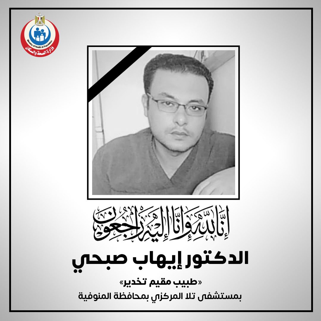 نعى الدكتور خالد عبد الغفار القائم بعمل وزير الصحة والسكان، وجميع العاملين بالوزارة، والجهات التابعة لها، ببالغ الحزن والأسى، الدكتور إيهاب صبحي، طبيب مقيم- تخدير، بمستشفى تلا المركزي في محافظة المنوفية، داعين المولى -عز وجل- أن يتغمده بواسع رحمته وأن يسكنه فسيح جناته وأن يلهم ذويه الصبر والسلوان.