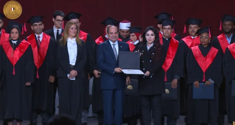 السيسي يطالب خريجي الأكاديمية الوطنية للتدريب برفع الكمامة لالتقاط صورة تذكارية