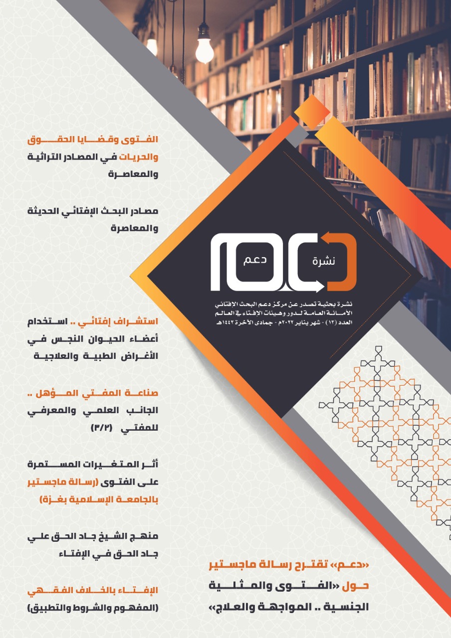 ورأى فريق تحرير نشرة دعم، أن يتطرق هذا العدد لتلك القضية، من خلال مقترح لرسالة ماجستير تناقش قضية المثلية الجنسية وموقف الفتوى المعاصرة منها، ودور الفتوى المتعدي لمجرد إطلاق الحكم إلى المعالجة المجتمعية لتلك القضية، خاصة في المجتمع الغربي، وجاء المقترح تحت عنوان الفتوى والمثلية الجنسية (المواجهة والعلاج).