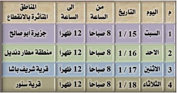 وبحسب بيان القطاع، سيتم قطع الكهرباء يوم السبت "15/1" عن جزيرة أبو صالح، ويوم الأحد "16/1" عن منطقة دنديل ويوم الاثنين "17/1" عن قرية رياض باشا، ويوم الثلاثاء "18/1" عن قرية سنور.