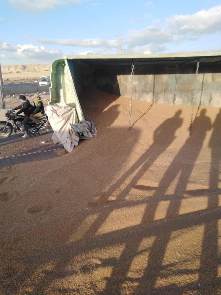 انقلاب سيارة نقل محملة بالقمح على الدائري الأوسطي | صور