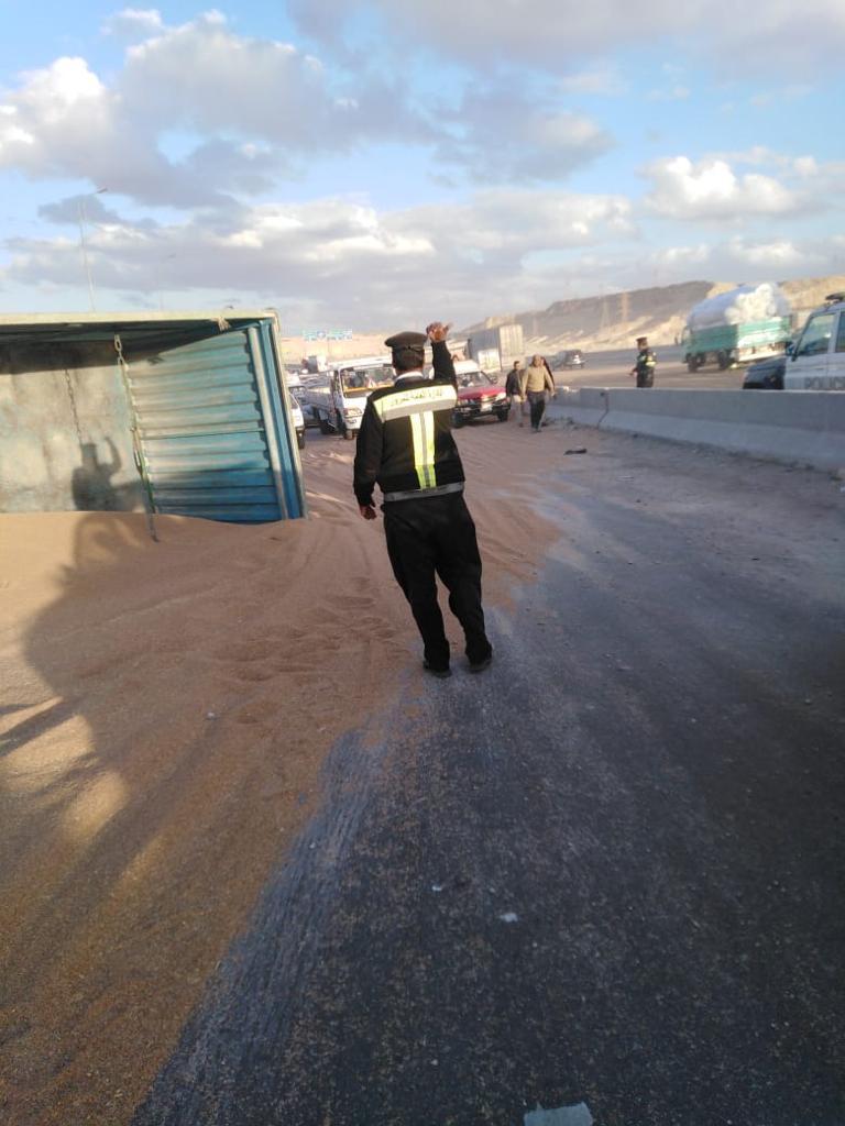 وقال مصدر إن سيارة نقل محملة بغلال القمح، انقلبت قبل نفق الأوتوستراد، نتيجة اختلال عجلة القيادة بيد السائق، وعلى الفور انتقلت قيادات الإدارة العامة للمرور لمكان الحادث لرفع السيارة والحمولة من على الطريق وعودة الحركة المرورية لطبيعتها.