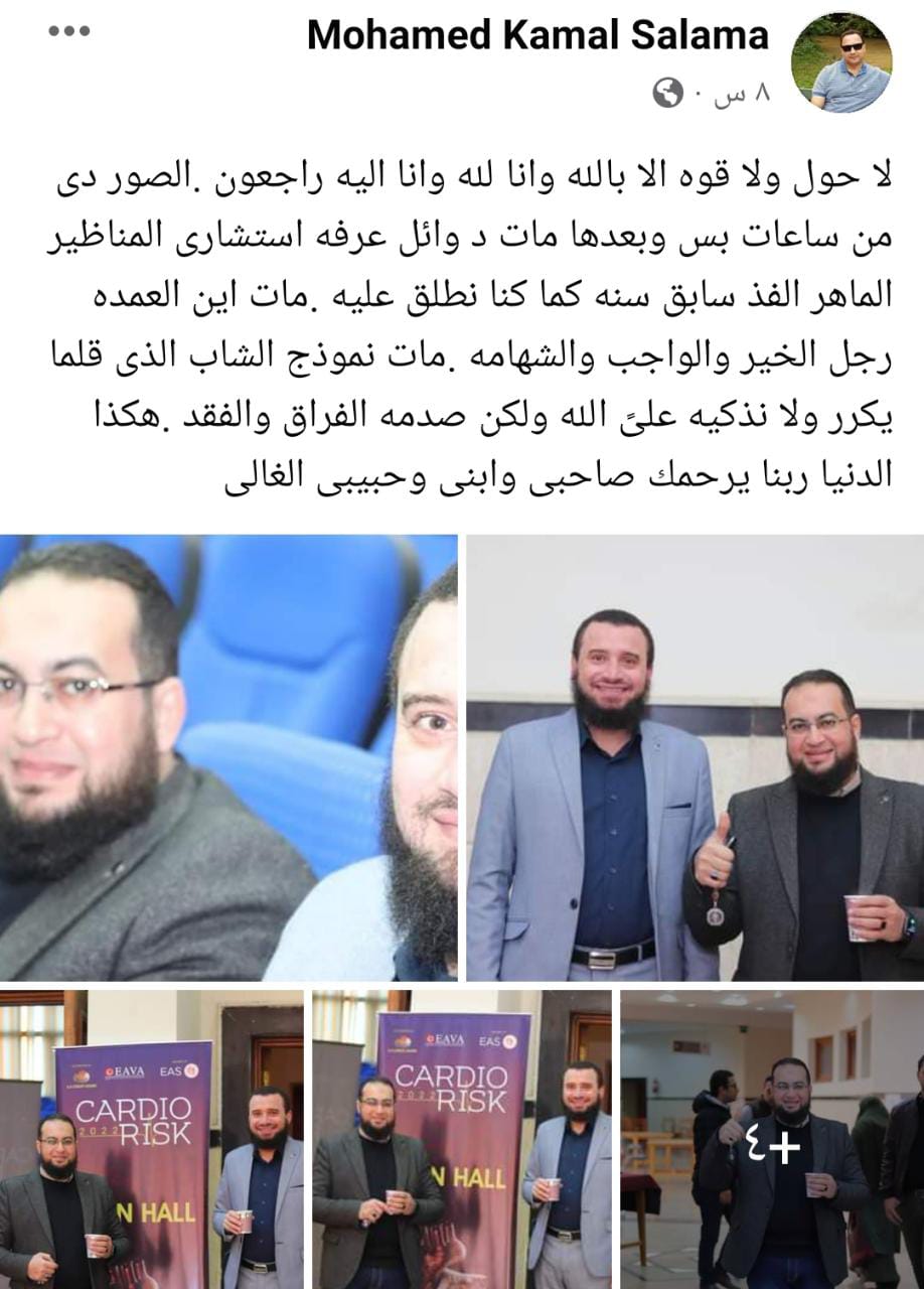 ونشر الدكتور محمد كمال سلامة، أستاذ أمراض القلب بطب كفر الشيخ، وواحدًا من منظمي مؤتمر أمراض القلب أمس، عبر حسابه الشخصي على موقع التواصل الاجتماعي فيسبوك: لا حول ولا قوة إلا بالله..الصور دي من ساعات بس وبعدها مات دكتور وائل عرفة، الماهر الفذ سابق سنه كما كنا نطلق عليه، رجل الخير والواجب والشهامة، مات نموذج قلما يُكرر ولا نزكيه على الله، هكذا الدنيا.