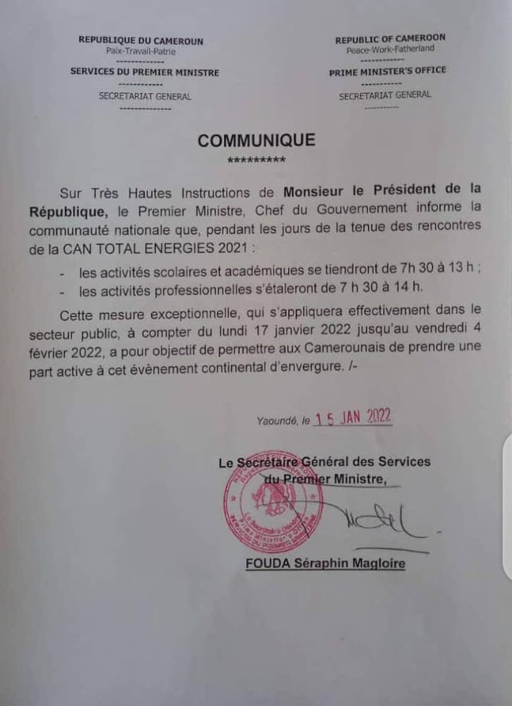 ونشرت رئاسة الوزراء في بيان لها منذ قليل: بناء على تعليمات عالية من رئيس الجمهورية، سيتم تعديل مواعيد الأنشطة الدراسة ويعتبر هذا الإجراء الاستثنائي، والذي سيتم تطبيقه بشكل فعال في القطاع العام يبدأ من يوم الاثنين 17 يناير 2022 حتى الجمعة 4 فبراير 2022، يهدف إلى السماح للكاميرونيين للمشاركة بنشاط في هذا الحدث القاري الكبير.