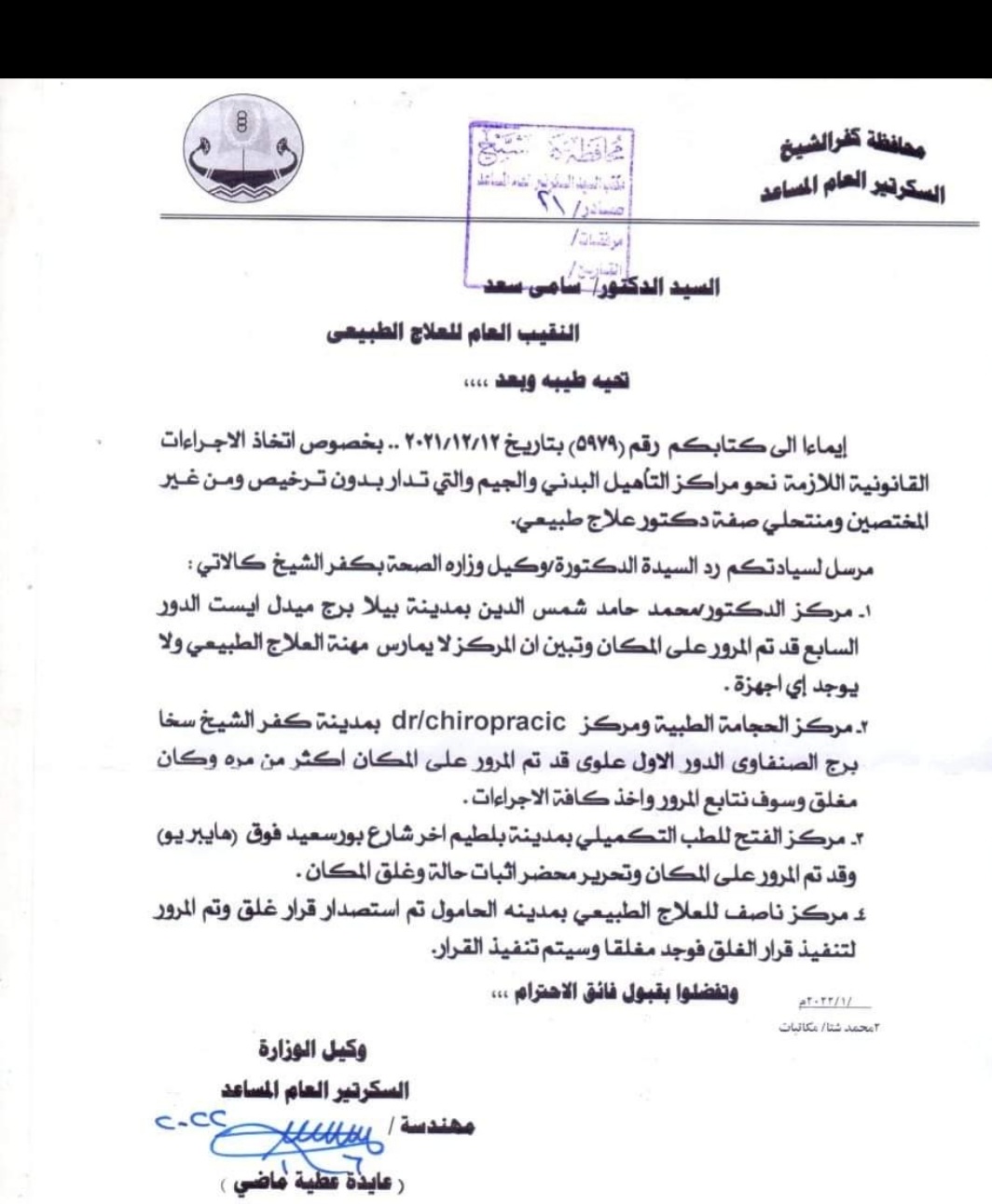 أرسلت المهندسة عايدة عطية السكرتير لعام المساعد لمحافظة كفر الشيخ، منشورا لنقيب العلاج الطبيعي الدكتور سامي سعد رد وكيل وزارة الصحة، وذلك بخصوص اتخاذ الإجراءات القانونية اللازمة نحو مراكز التأهيل البدني والجيم، والتي تدار دون تـرخيص ومن غـير المختصين ومنتحلي صفة دكتور علاج طبيعي في المحافظة.