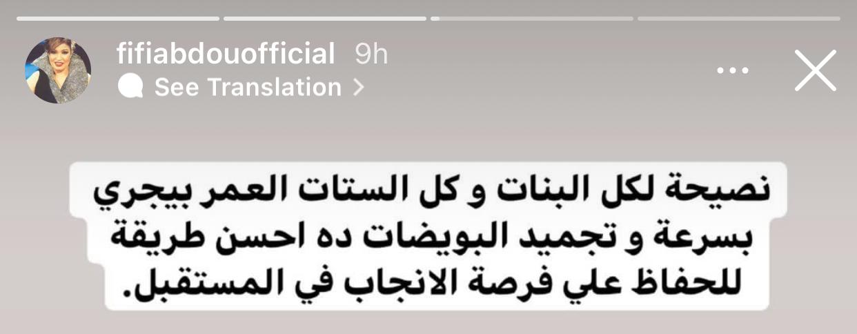 وكتبت فيفي عبر خاصية ستوري من خلال حسابها الرسمي على موقع انستجرام: نصيحة لكل البنات ولكل الستات، العمر بيعدي بسرعة بينا، وتجميد البويضات دي أحسن طريقة للحفاظ على إمكانية الإنجاب مرة أخرى في المستقبل.
