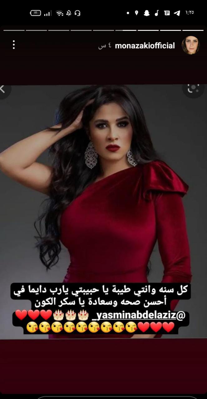 ونشرت الفنانة منى ذكي صورة لياسمين عبد العزيز عبر خاصية استوري حسابها الشخصي بموقع الصور والفيديوهات القصيرة انستجرام، معلقة عليها قائلة: كل سنة وأنت طيبة يا حبيبتي، يارب دايمًا في أحسن صحة وسعادة يا سكر الكون.