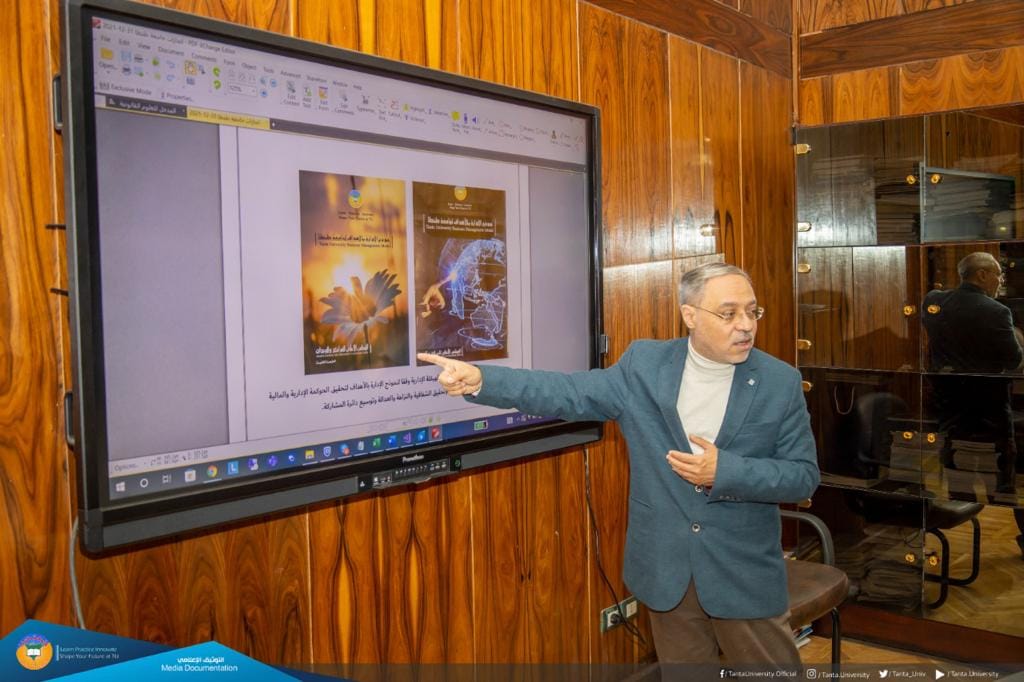 كما استعرض محمود ذكي، الإجراءات التي اتخذتها الجامعة في منظومة التحول الرقمي والمنصات الرقمية وتطبيق نموذج الادارة بالأهداف