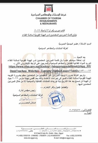 قال عادل المصري رئيس غرفة المنشآت والمطاعم السياحية، في خطاب موجه إلى أعضاء الغرفة إنه لا بد لجميع المطاعم والمنشآت السياحية التسجيل في قائمة الموردين المعتمدة من الهيئة القومية لسلامة الغذاء.