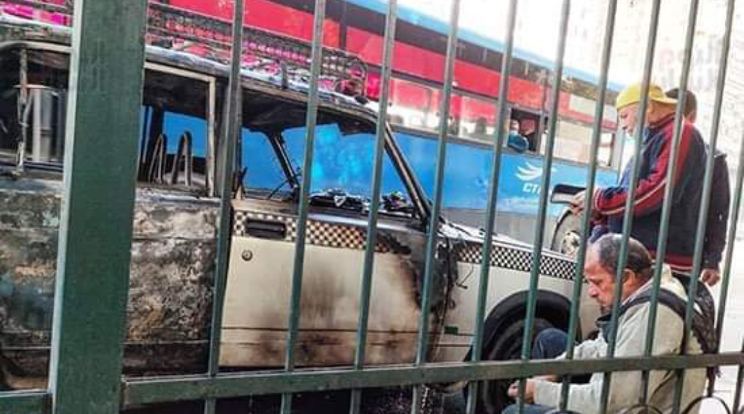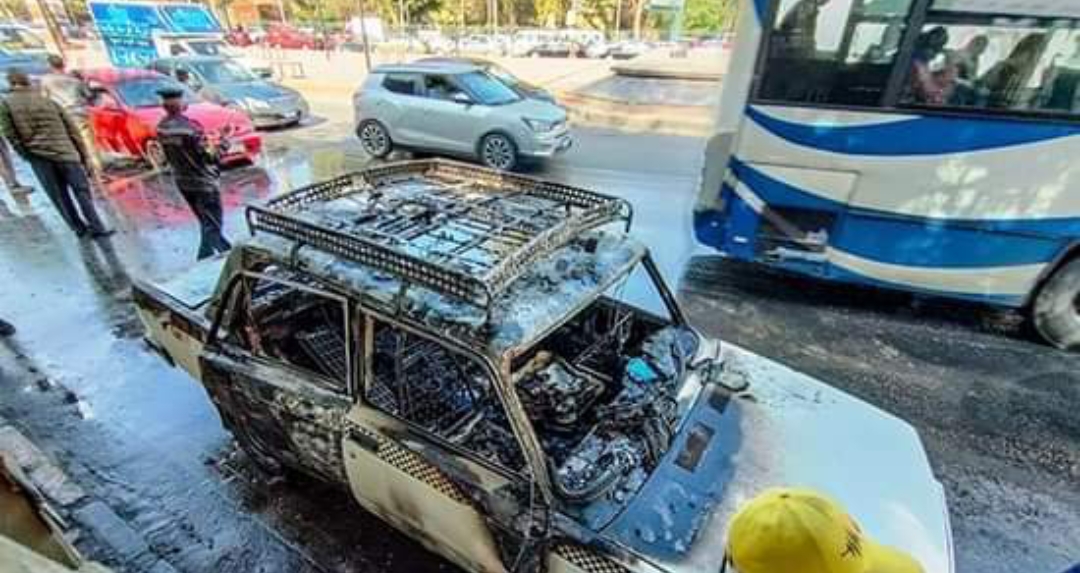 نشب حريق في سيارة أجرة بميدان النهضة، كانت في محيط المكان، ما أسفر عن تفحم السيارة بالكامل.