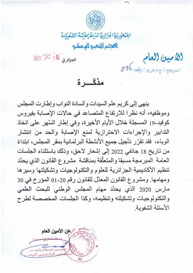 وجاء في بيان البرلمان الجزائري عبر صفحته الرسمية على موقع التواصل الاجتماعي تويتر: ينهى إلى كريم علم السيدات والسادة النواب وإطارات المجلس وموظفيه، أنه نظرا للارتفاع المتصاعد في حالات الإصابة بفيروس كورونا المسجلة خلال الأيام الأخيرة، وفي إطار السهر على اتخاذ التدابير والإجراءات الاحترازية لمنع الإصابة والحد من انتشار الوباء، فقد تقرر تأجيل جميع الأنشطة البرلمانية بمقر المجلس، ابتداء من تاريخ 18 يناير 2022 إلى إشعار لاحق.