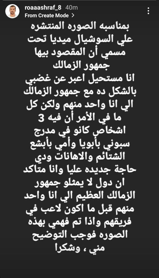 وقال روقا عبر خاصية استوري على انستجرام: بمناسبة الصور التي انتشرت على السوشيال ميديا تحت مسمى أن المقصود بها جمهور نادي الزمالك، أنا مستحيل أعبر عن غضبي بهذا الشكل أمام الجمهور الزمالك، وأنا واحد من هذا الجمهور.
