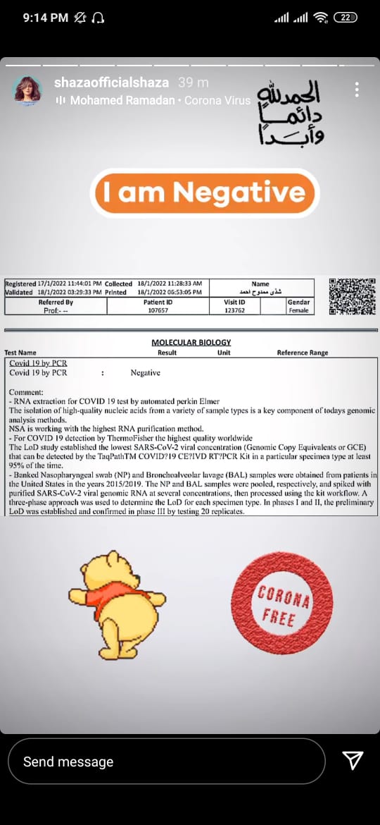 ونشرت شذى نتيجة فحص فيروس كورونا الذي خضعت له أمس، وذلك عبر خاصية ستوري لحسابها الشخصي على موقع تبادل الصور والفيديوهات القصيرة انستجرام، وعلقت قائلة: سلبي.. خالية من كورونا.