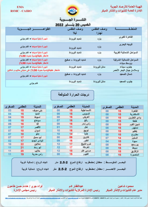 وفقًا لبيان هيئة الأرصاد الجوية، يسود غدًا طقس بارد نهارًا على القاهرة الكبرى والوجه البحري والسواحل الشمالية ووسط سيناء، مائل للبرودة على جنوب سيناء وجنوب الصعيد وسلاسل جبال البحر الأحمر.