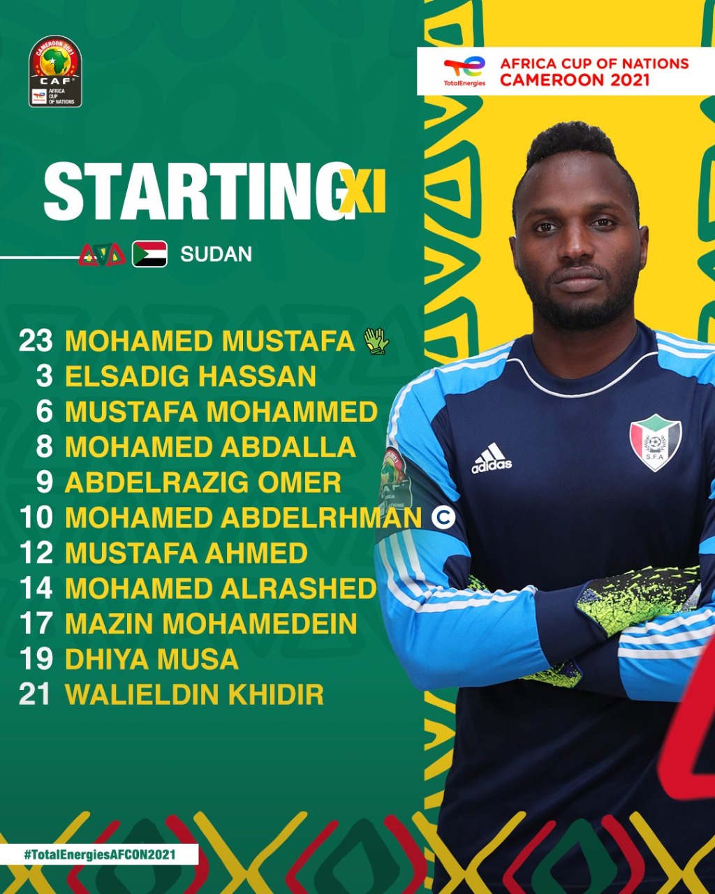 أعلن برهان تية، المدير الفني لمنتخب السودان، تشكيل فريقه لمواجهة منتحب مصر، ضمن مباريات الجولة الثالثة من دور المجموعات لبطولة كأس الأمم الإفريقية في لقاء قوي بين المنتخبين.