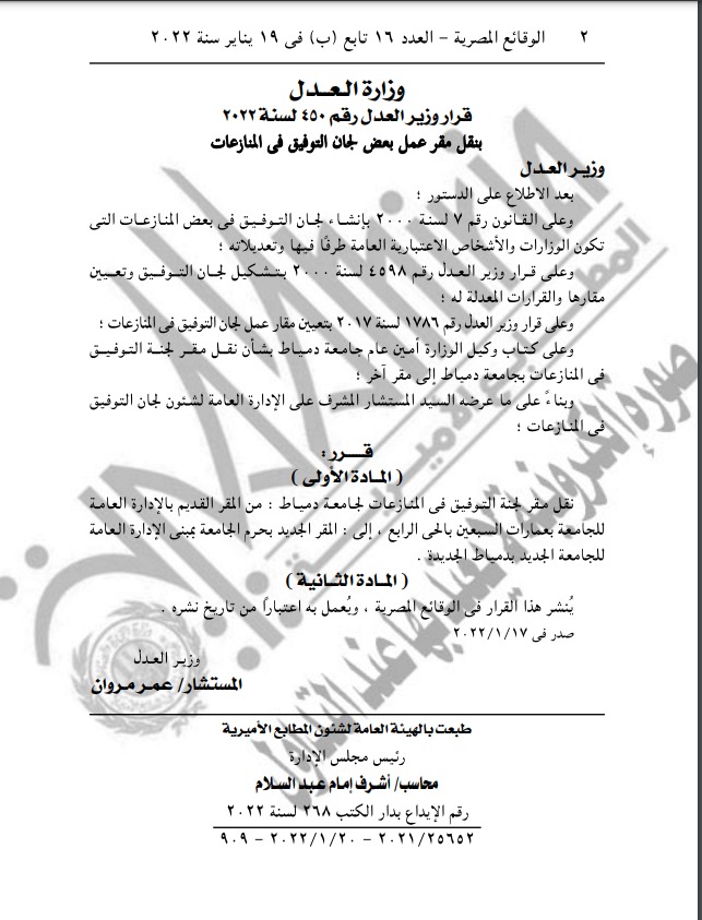 أصدر المستشار عمر مروان وزير العدل، القرار رقم 450 لسنة 2022، بشأن نقل مقر عمل بعض لجان التوفيق في المنازعات.