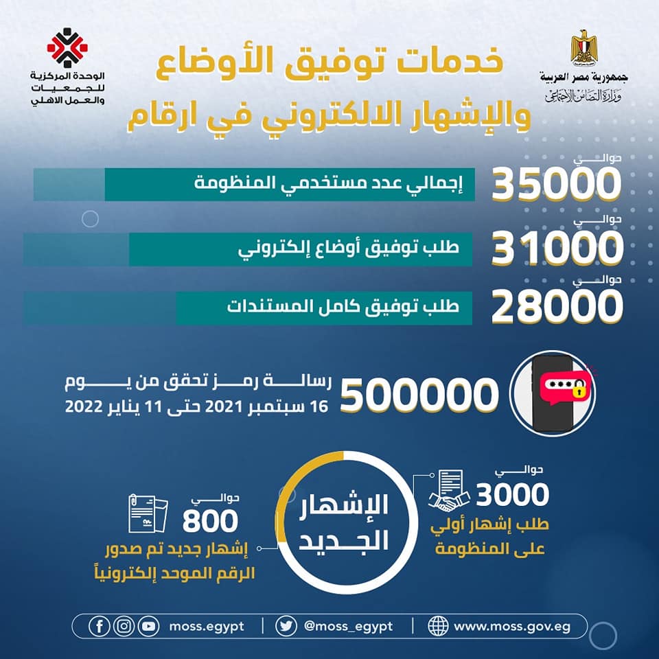 وأوضحت الوزارة، أن المنظومة تلقت حتى الأن نحو 31 ألف طلب توفيق أوضاع إلكتروني للجمعيات الأهلية، ونحو 28 ألف طلب توفيق كامل المستندات، فيما وصل عدد مستخدمي المنظومة نحو 35 ألف مستخدم، ونحو 500 ألف رسالة رمز تحقق من يوم 16 سبتمبر 2021 وحتى 11 يناير الجاري، كما استقبلت المنظومة 3 آلاف طلب إشهار أولي على المنظومة، و800 إشهار جديد؛ تم صدور الرقم الموحد إلكترونيًا.