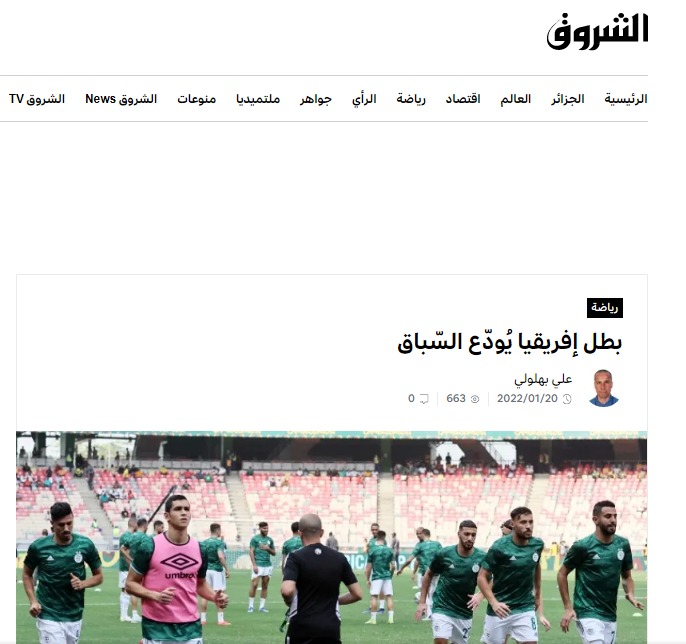عنونت صحيفة الشروق الجزائرية بـ بطل إفريقيا يُودّع السّباق، وذلك بعد أن ودع حامل النسخة الأخيرة من كان النسخة الحالية المقامة بالكاميرون مبكرًا، من دور المجموعات بشكل رسمي بعد السقوط أمام كوت ديفوار بثلاثية.