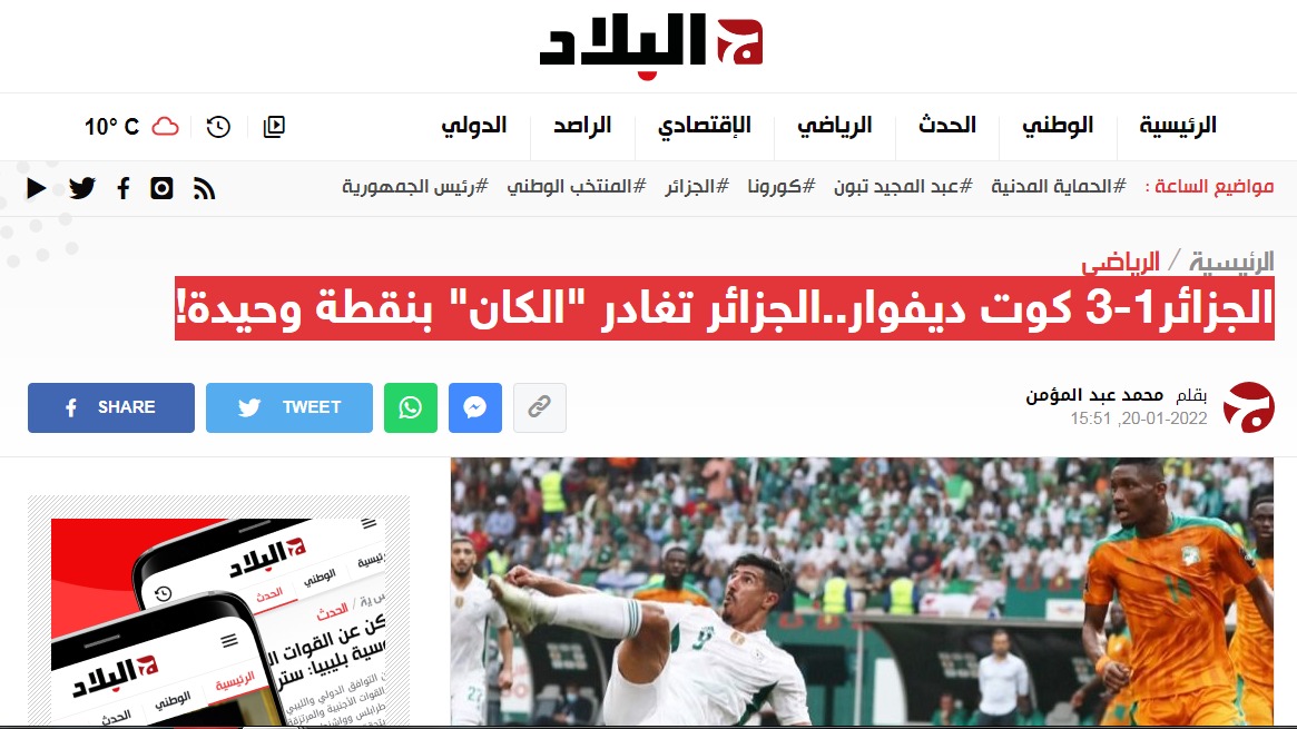 سلطت الصحيفة الضوء على ضعف أداء المنتخب الجزائري في أمم إفريقيا 2021، حيث قالت صحيفة البلاد: الجزائر1-3 كوت ديفوار..الجزائر تغادر الكان بنقطة وحيدة!