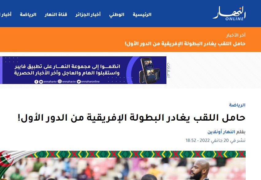 تعجبت صحيفة النهار من أداء المنتخب الجزائري على مدار النسخة الحالية من البطولة، حيث تصدر العنوان حامل اللقب يغادر البطولة الإفريقية من الدور الأول!، الصفحة الرئيسية من الصحيفة بعد وداع أبناء بلماضي للكان.