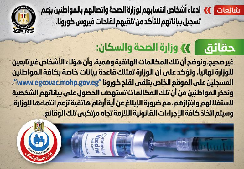 وأكدت وزارة الصحة والسكان أن الوزارة تمتلك قاعدة بيانات خاصة بكافة المواطنين المسجلين على الموقع الخاص بتلقي لقاح كورونا "www.egcovac.mohp.gov.eg"، مُحذرةً المواطنين من أن تلك المكالمات تستهدف الحصول على بياناتهم الشخصية لاستغلالهم وابتزازهم، مع ضرورة الإبلاغ عن أي أرقام هاتفية تزعم انتماءها للوزارة، وسيتم اتخاذ كافة الإجراءات القانونية اللازمة تجاه مرتكبي تلك الوقائع.