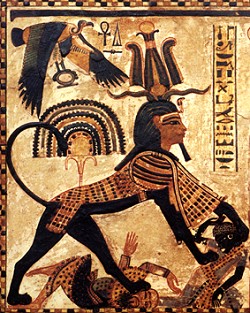 أطلق اسم أبو الهول على مخلوق له جسد أسد ورأس (أو على الأقل وجه) بشر أو حيوانات أخرى؛ مثل رأس كبش (مرتبط بالرب آمون)، ويرتدى أبو الهول عادة غطاء الرأس الملكي المعروف باسم "النمس" وتصور معظم التماثيل المعروفة أبو الهول رابضًا؛ وإن البعض يصوره أيضًا واقفًا أو ساترًا.