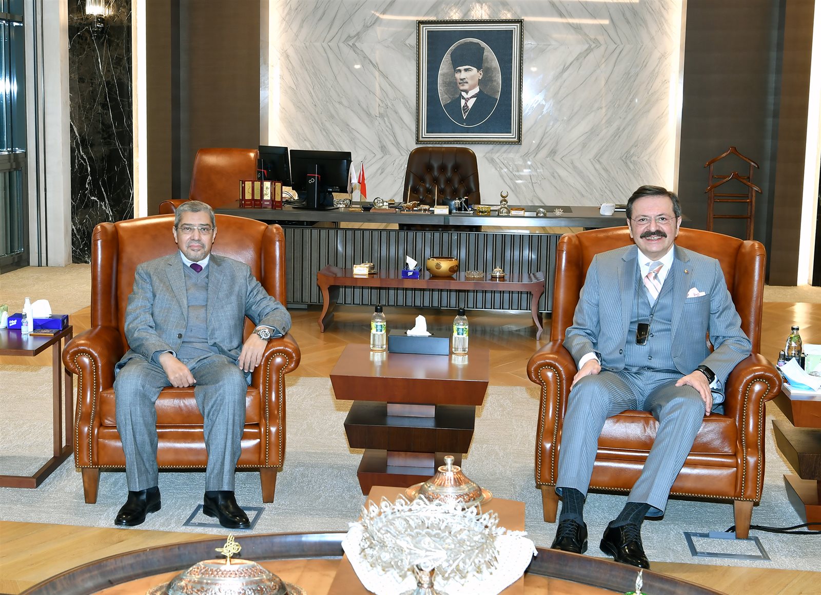 وخلال المناقشات أكد رئيس اتحاد الغرف وبورصات السلع في تركيا، أن المستثمرين الأتراك لن يتوقفوا أبدًا عن الاستثمار في مصر ويريدون توسيع نطاق العلاقات الثنائية، موضحًا أن الحوار بين البلدين جعل عالم الأعمال في كلا البلدين سعيدًا، وعلى استعداد لبذل قصارى جهدهما للمساهمة في هذه العملية.