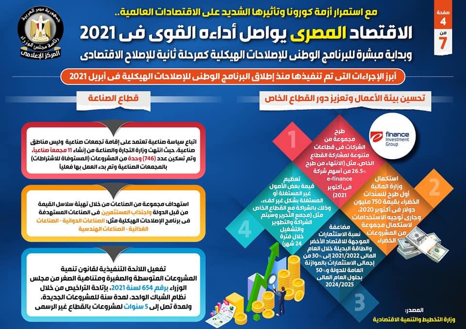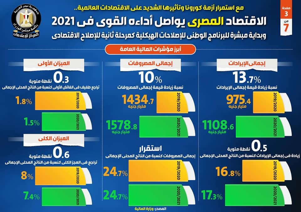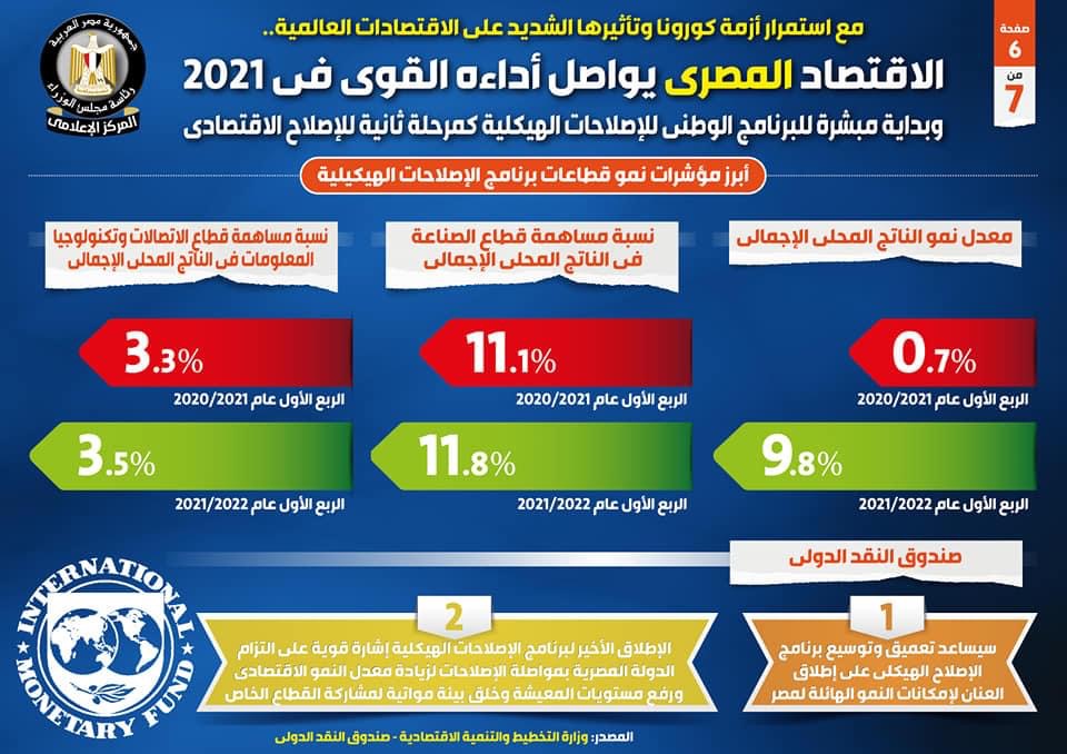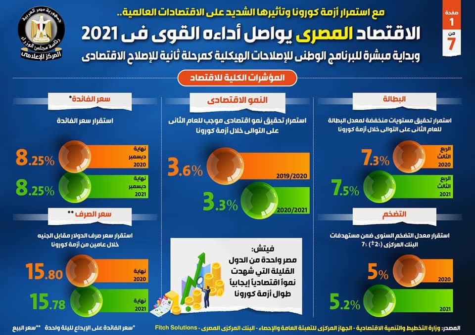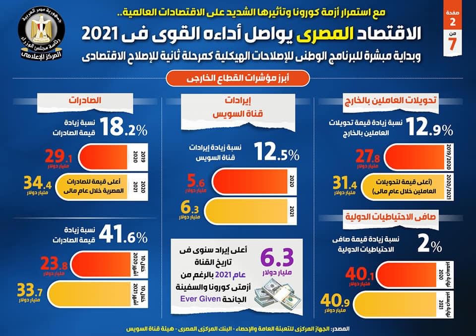 نشر المركز الإعلامي لـ مجلس الوزراء تقريرا تضمن إنفوجرافات تسلط الضوء على مواصلة الاقتصاد المصري أداءه القوي في 2021، والبداية المبشرة للإصلاحات الهيكلية كمرحلة ثانية للإصلاح الاقتصادي.