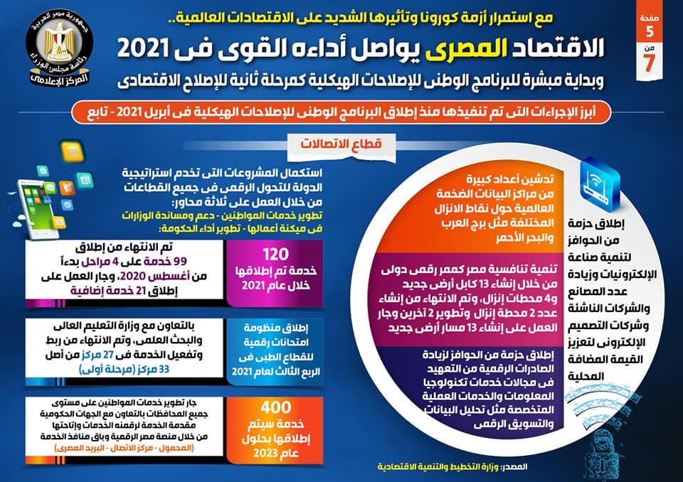 واستكمالًا لاستعراض أبرز الإجراءات التي تم تنفيذها منذ إطلاق البرنامج الوطني للإصلاحات الهيكلية، أظهر التقرير أن قطاع الاتصالات قد شهد إطلاق حزمة من الحوافز لتنمية صناعة الإلكترونيات وزيادة عدد المصانع، والشركات الناشئة وشركات التصميم الإلكتروني لتعزيز القيمة المضافة المحلية، وتم تدشين أعداد كبيرة من مراكز البيانات الضخمة العالمية حول نقاط الإنزال المختلفة، مثل برج العرب والبحر الأحمر.