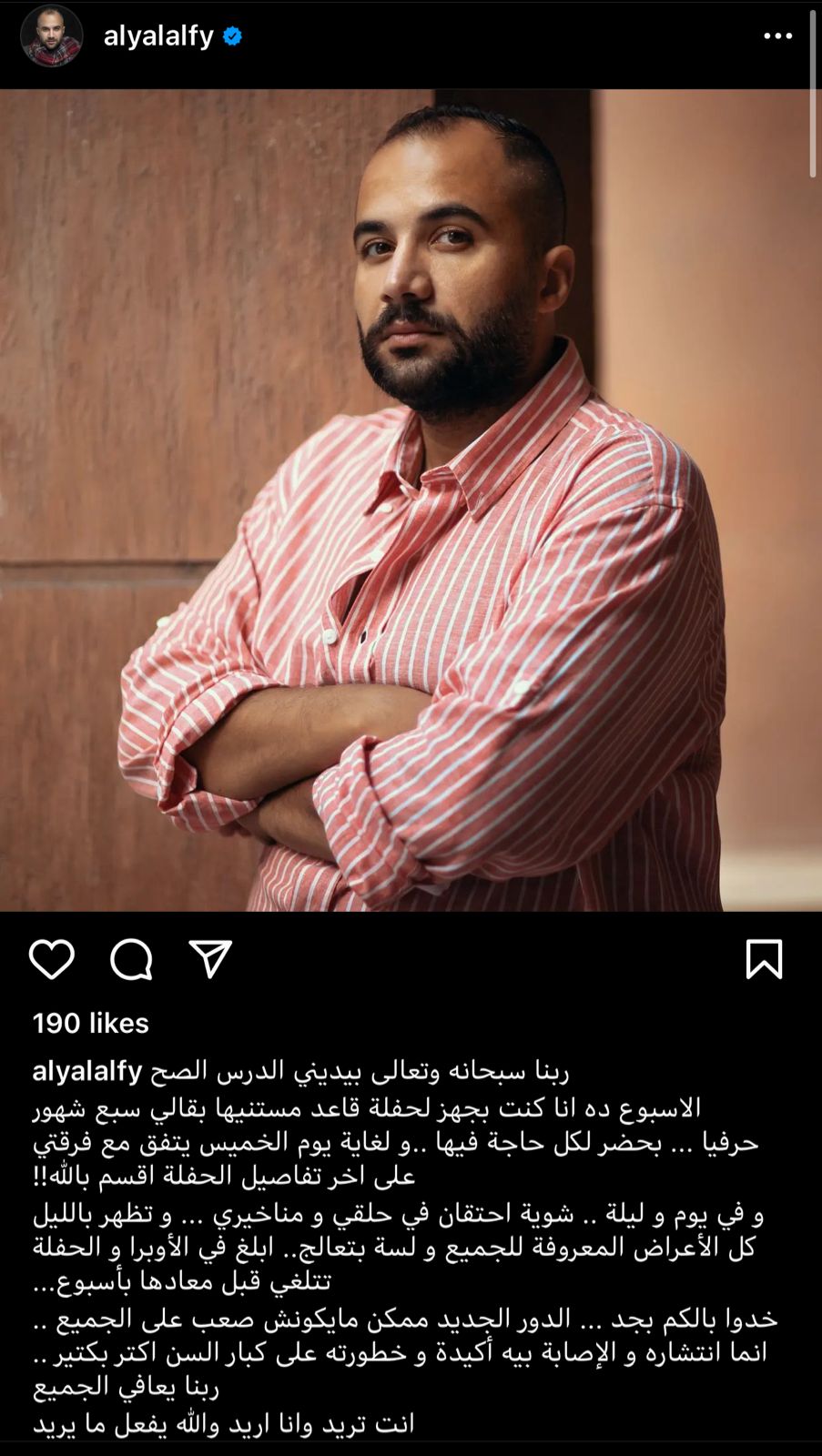 ونشر علي الألفي، صورة له عبر حسابه، بموقع تبادل الصور والفيديوهات القصيرة انستجرام، معلقًا: ربنا سبحانه وتعالى بيديني الدرس الصح، الأسبوع ده أنا كنت بجهز لحفلة قاعد مستنيها بقالي 7 شهور حرفيًا.. بحضر لكل حاجة فيها، ولغاية يوم الخميس بتفق مع فرقتي على آخر تفاصيل الحفلة أقسم بالله!