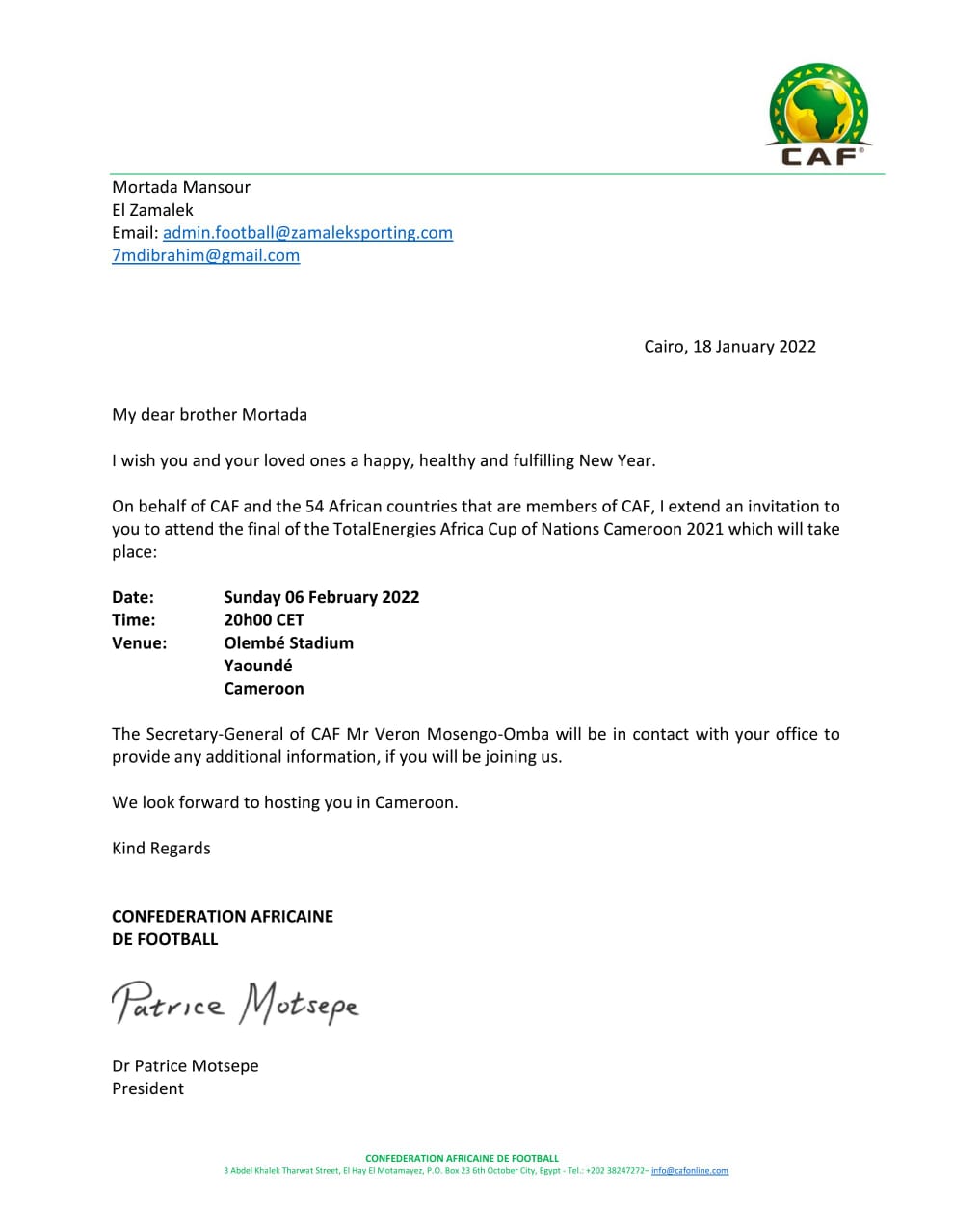 تلقى المستشار مرتضى منصور رئيس مجلس إدارة نادي الزمالك، دعوة رسمية من الاتحاد الإفريقي لكرة القدم الكاف، برئاسة الجنوب إفريقي باتريس موتسيبي، لحضور المباراة النهائية لبطولة أمم إفريقيا في نسختها الـ33 المقامة حاليا بالكاميرون، والمقرر لها في السادس من فبراير المقبل.