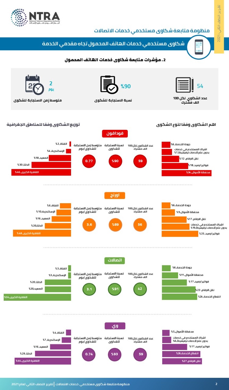 أصدر الجهاز القومي لتنظيم الاتصالات التقرير النصف سنوي الثاني لمنظومة متابعة شكاوى مستخدمي خدمات الاتصالات، عن الفترة من يوليو إلى ديسمبر 2021، والذي يعرض أهم المؤشرات المتعلقة بشكاوى مستخدمي خدمات الهاتف الثابت والمحمول والانترنت الثابت وأجهزة التليفون المحمول، ونسبة ووقت الاستجابة لشكاوى العملاء بعد تصعيدها للجهاز القومي لتنظيم الاتصالات، ويأتي ذلك في إطار حرص الجهاز على دعم حقوق المستخدمين وضمان تقديم خدمات اتصالات ذات جودة في السوق المصري.