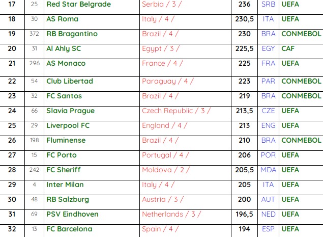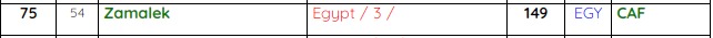 وعلى صعيد الأندية المصرية الأخرى التي اقتحمت الترتيب، وُجد فريق الزمالك في المركز الـ 75، بعد أن كان في المركز الـ 54 خلال العام الماضي، بينما احتل فريق بيراميدز المركز الـ 55، بعد أن كان في المركز 103 خلال 2020.