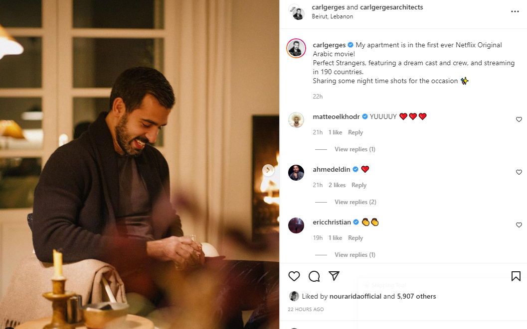 وعلق جرجس على الصور قائلا: شقتي موجودة في أول فيلم إنتاج عربي لنتفليكس، النسخة العربية من الفيلم الإيطالي perfect strangers، الفيلم معروض في 190 دولة.