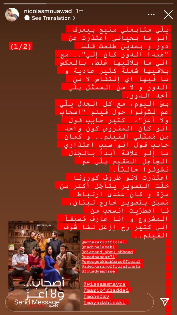 وكتب نيقولا معوض عبر خاصية استوري على حسابه الرسمي على موقع تبادل الصور والفيديوهات، انستجرام: اللي متابعني كويس هيعرف أني عمري في حياتي ما طلعت وقولت الدور ده كان ليا، مع أني مش شايفها حاجة غلط، وبالعكس بلاقيها شيء عادي جدا، ولا يوجد بها أي انتقاص من الدور أو الممثل اللي أخد الدور.