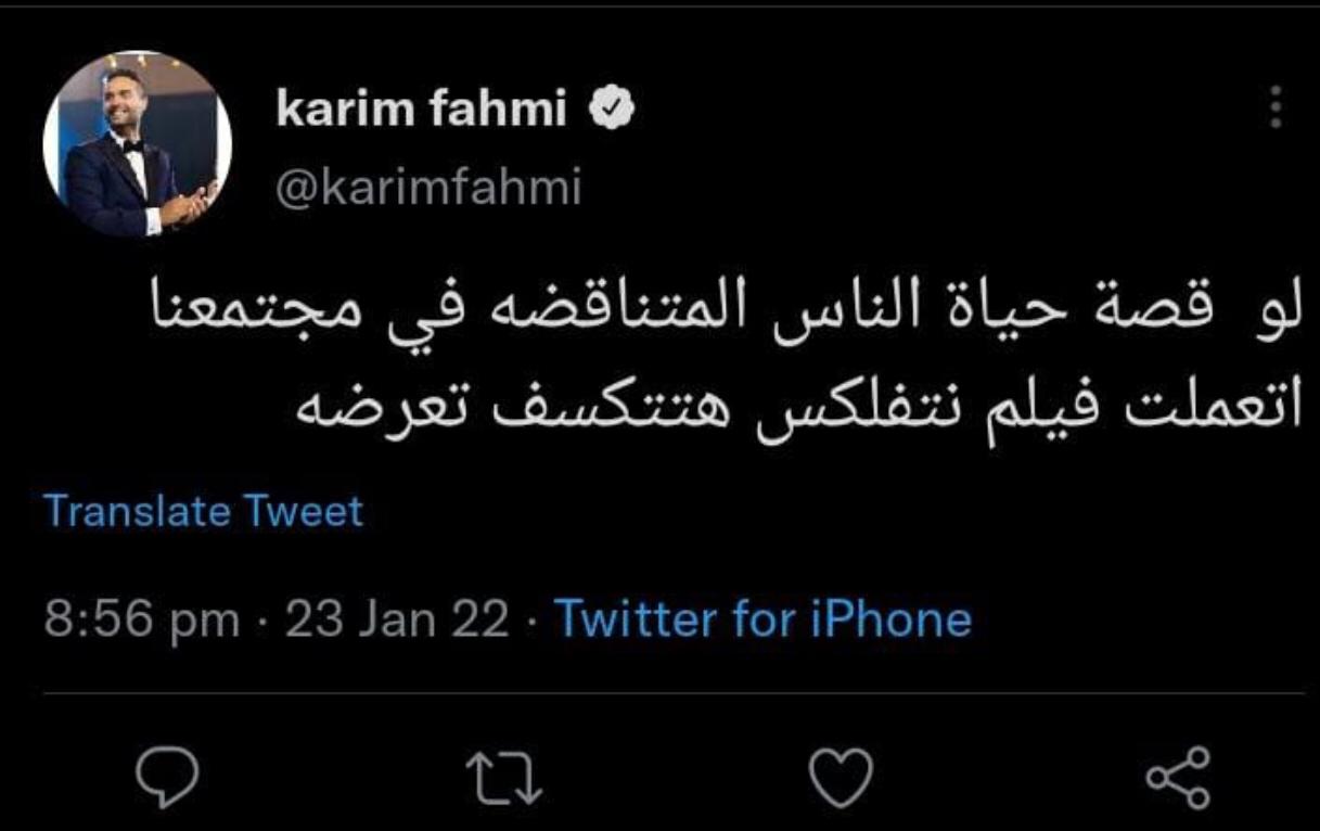 وكتب كريم فهمي تغريدة عبر حسابه الشخصي بموقع التدوينات القصيرة تويتر، وقال: لو قصة حياة الناس المتناقضة في مجتمعنا اتعملت فيلم، نتفلكس هتتكسف تعرضه.