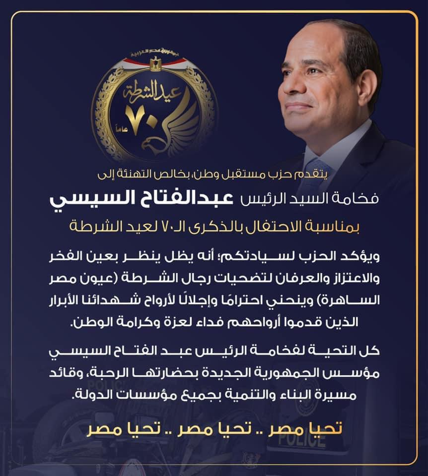 تقدم حزب مستقبل وطن، بخالص التهنئة إلى الرئيس عبدالفتاح السيسي، بمناسبة الاحتفال بالذكرى الـ 70 لعيد الشرطة.